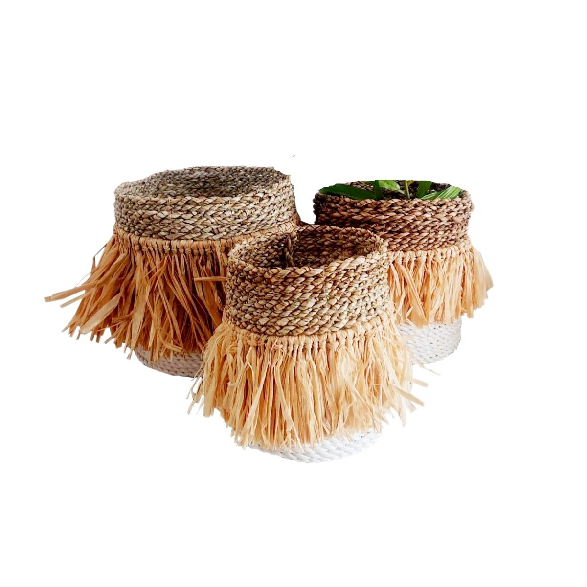 Verleihen Sie Ihrem Interieur mit diesen wunderschönen Körben aus Seegras , aufgewertet durch elegante Fransen aus natürlichem Bast, einen Hauch von Bohème-Chic . Diese auf der Insel Bali handgefertigten Körbe vereinen natürlichen Charme und Funktionalität . Ihr schlankes Design und die geflochtene Textur machen sie zum perfekten Accessoire für die Organisation und Verschönerung Ihres Raums.