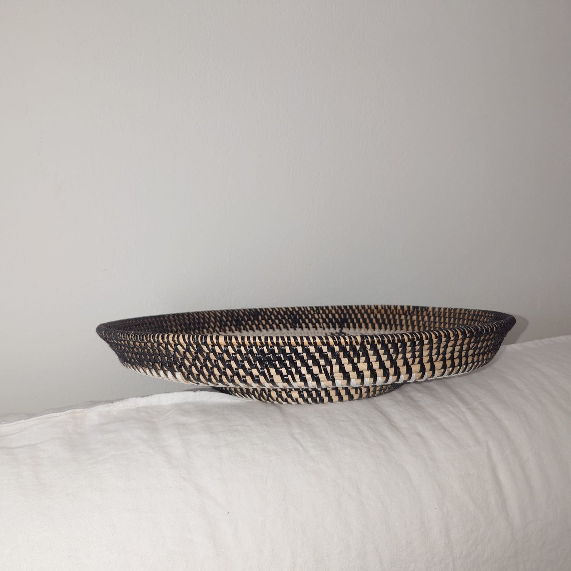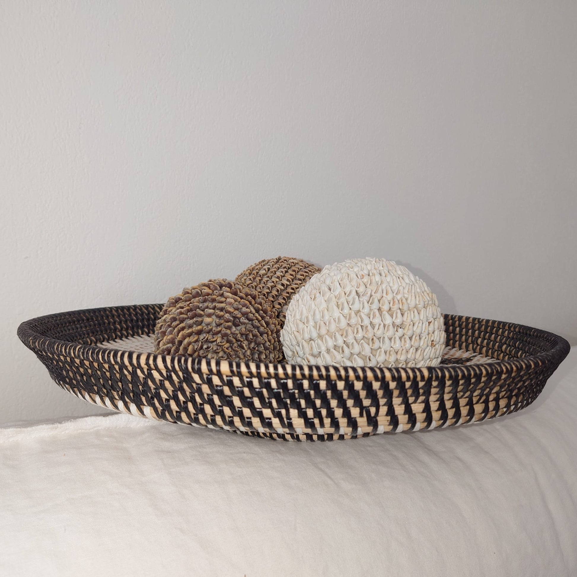 Verleihen Sie Ihrem Interieur mit diesem runden Tablett aus geflochtenem Rattan einen Hauch natürlicher Eleganz und schicker ethnischer Wärme . Seine von Hand gefertigten grafischen Muster verleihen Ihren Räumen echte Persönlichkeit . Dieses Tablett ist vielseitig einsetzbar und kann sowohl als Wanddekoration als auch als funktionaler Gegenstand verwendet werden.